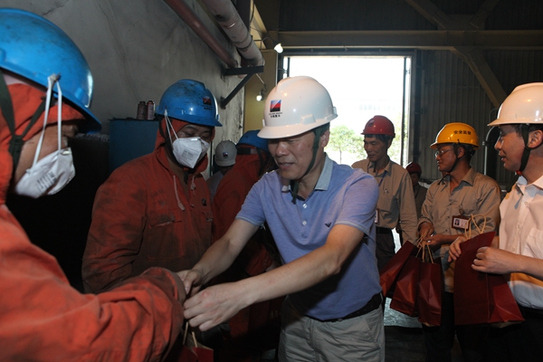 呂美溪、許強(qiáng)一行首先來到3號爐磨煤機(jī)檢修現(xiàn)場,看到奮戰(zhàn)在高溫下的嘉電人,疾步上前遞上清涼用品,并殷切囑咐道:“大家辛苦了,天氣炎熱,大家要注意身體、注意安全!”叮囑在場的部門負(fù)責(zé)人要注意職工身體情況,多輪班。隨后,呂美溪、許強(qiáng)一行來到“中國首臺超低排放機(jī)組”控制室,與精心操作的運(yùn)行人員一一握手,送上清涼用品。