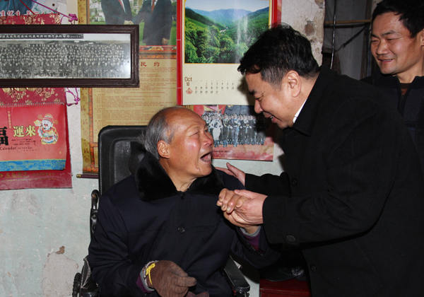 從項(xiàng)艷飛家中出來后,張兆都一行驅(qū)車35公里來到長興縣白峴鄉(xiāng)和岕口村嶺上自然村,走訪慰問居住在這里的退休職工章長福。章長福曾獲煤炭部勞模稱號,退休后因患腦溢血,生活不能自理。張兆都一進(jìn)章長福家門,就握著老章和他老伴的手,噓寒問暖。在老章家簡陋的小屋里,張兆都和老章親切交談。當(dāng)?shù)弥险履贻p時擔(dān)任礦井采煤隊(duì)長,勇奪高產(chǎn)作貢獻(xiàn)的事跡時,張兆都向老章伸出大拇指,連聲稱贊:“你為長廣的建設(shè)發(fā)展作出了貢獻(xiàn),組織上不會忘記。今天,省總工會、浙能集團(tuán)工會、長廣集團(tuán)領(lǐng)導(dǎo)都來看望你,希望你生活愉快,安度晚年。”章長福十分激動地說:“領(lǐng)導(dǎo)和組織時常關(guān)心、照顧著我,非常感謝。”