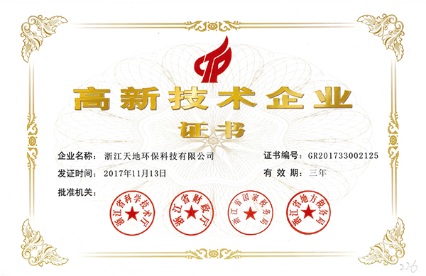 近日,浙江天地環(huán)保科技有限公司獲得了由浙江省科學(xué)技術(shù)廳、浙江省財政廳、浙江省國家稅務(wù)局、浙江省地方稅務(wù)局聯(lián)合頒發(fā)的《高新技術(shù)企業(yè)證書。自2008年初次通過國家高新企業(yè)認定以來,天地公司已連續(xù)四次通過國家高新企業(yè)認定。國家高新技術(shù)企業(yè)評定是國家對具有自主知識產(chǎn)權(quán)的高科技企業(yè)的一項扶持政策,是我國科技創(chuàng)新類最高獎項之一。天地公司再次獲得認證標(biāo)志著該公司在環(huán)境治理行業(yè)創(chuàng)新領(lǐng)域連續(xù)十年得到了國家相關(guān)部門的肯定。