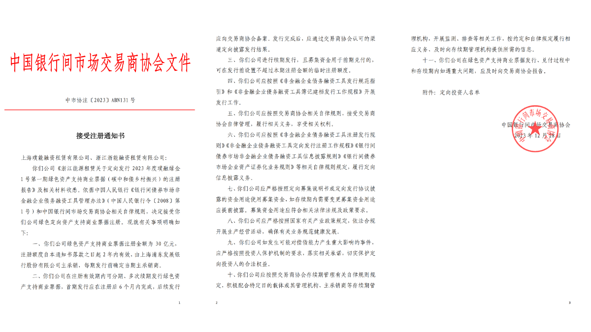 近日,浙能(璞能)融資租賃公司成功獲批浙江能源租賃2023年度璞融綠金1號第一期綠色定向資產(chǎn)支持商業(yè)票據(jù)(碳中和債/鄉(xiāng)村振興)項目,標(biāo)志著浙江省內(nèi)首例“碳中和債/鄉(xiāng)村振興”資產(chǎn)支持商業(yè)票據(jù)產(chǎn)品獲批。項目注冊金額30億,首期獲批金額6.21億,單期發(fā)行不超過180天(可滾動發(fā)行),也是全省首例雙主體注冊資產(chǎn)支持商業(yè)票據(jù)(ABCP)。