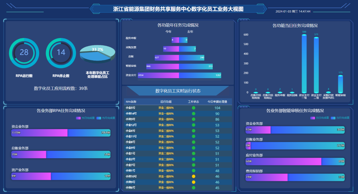 浙能財務(wù)共享運營平臺上線以來已推廣21批線上運行427家單位,開發(fā)129支標(biāo)準(zhǔn)化流程,與SAP等20個業(yè)財系統(tǒng)實現(xiàn)集成,覆蓋用戶3萬余人,從無到有打造以智能化、流程和數(shù)據(jù)驅(qū)動、業(yè)財稅資檔一體貫通、財務(wù)風(fēng)險控制和財務(wù)人才培養(yǎng)為主,富有浙能特色、不斷迭代升級、賦能價值創(chuàng)造的財務(wù)共享金名片,走在浙江國資國企前列。在數(shù)智化方面,該平臺采用統(tǒng)一架構(gòu)的端到端數(shù)字化平臺,利用IPA智能流程自動化、OCR智能審核、AI、NLP自然語言處理、全場景遠(yuǎn)程辦公等先進(jìn)技術(shù)手段,搭建起流程、審核、運營和數(shù)治四個方面組成的智能應(yīng)用體系,實現(xiàn)憑證和支付自動化率雙雙超過99%,其中數(shù)字員工、數(shù)字化監(jiān)督看板、智能語音提單、智能派單、智能客服等一批功能應(yīng)用頗具特色、業(yè)內(nèi)領(lǐng)先,榮獲上國會“2022年智能財務(wù)最佳實踐年度綜合大獎”。