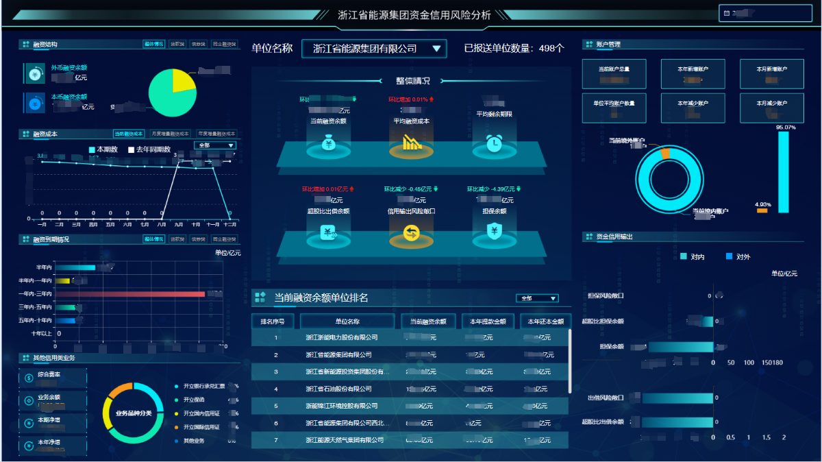 資金信用風(fēng)險管理系統(tǒng)分兩部分,一是部署于省國資委財務(wù)風(fēng)險監(jiān)測平臺下的資金信用風(fēng)險子系統(tǒng),應(yīng)用于省國資委及各省屬企業(yè),旨在加強國資國企資金信用風(fēng)險監(jiān)測;二是部署于浙能集團(tuán)的資金管理系統(tǒng),旨在提升資金管理精細(xì)化、集約化及智能化水平,提高資金運營效率,防范資金風(fēng)險。到目前,國資委側(cè)系統(tǒng)已完成17家省屬企業(yè)集團(tuán)推廣,企業(yè)側(cè)系統(tǒng)已完成浙能集團(tuán)約500家成員單位推廣。歷經(jīng)多次版本更迭,系統(tǒng)功能不斷完善,已實現(xiàn)賬戶全生命周期閉環(huán)管理、融資業(yè)財一體化管理、債務(wù)風(fēng)險預(yù)警、資金信用輸出風(fēng)險監(jiān)測、大屏智能化分析等功能,切實提升省屬國資國企資金信用風(fēng)險管理水平。