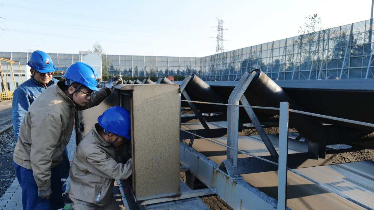 11月27日,浙能港口公司電儀班員工在煤炭堆場(chǎng)C6D皮帶處對(duì)拉繩開關(guān)進(jìn)行檢查。 錢威 攝