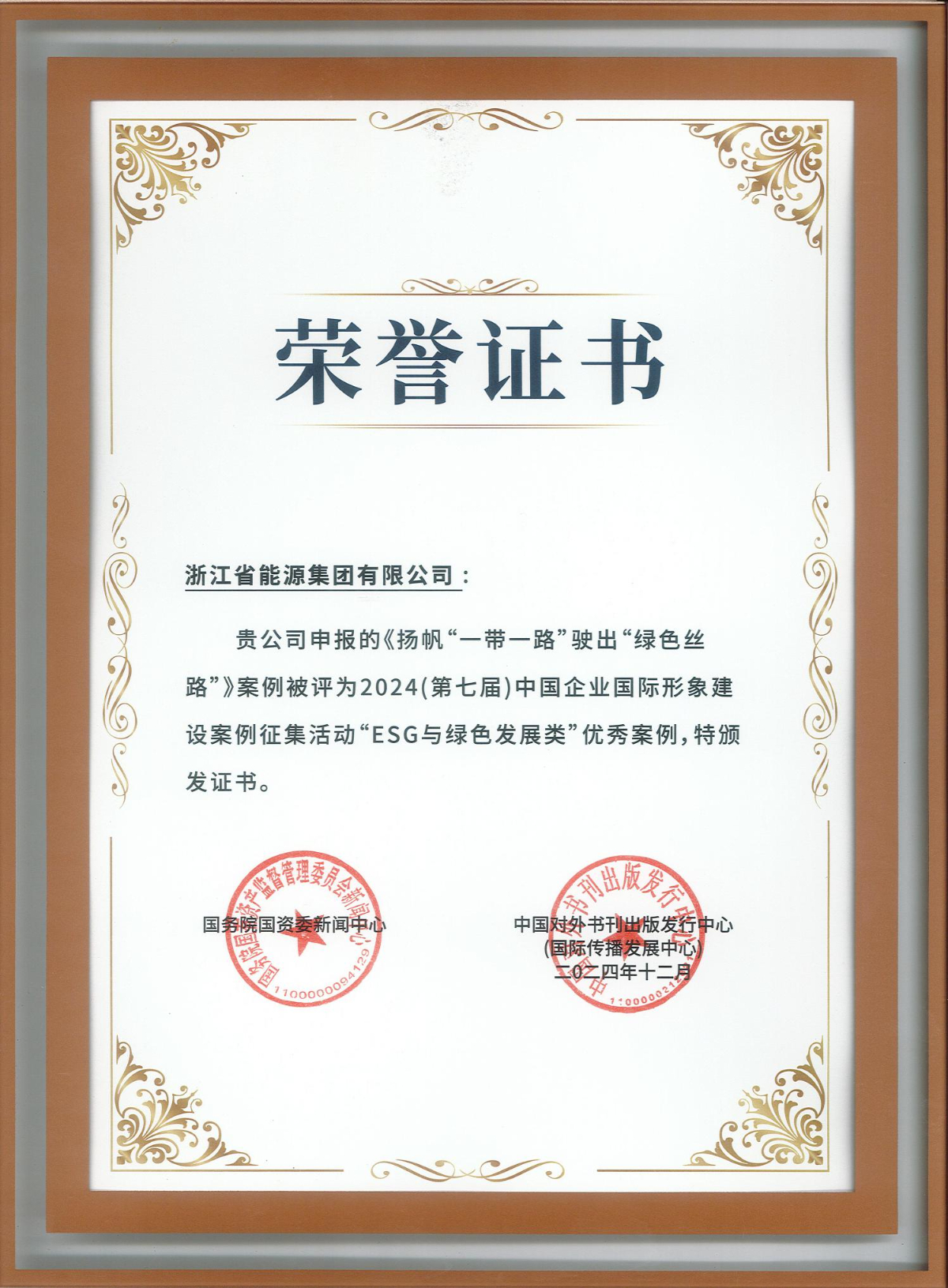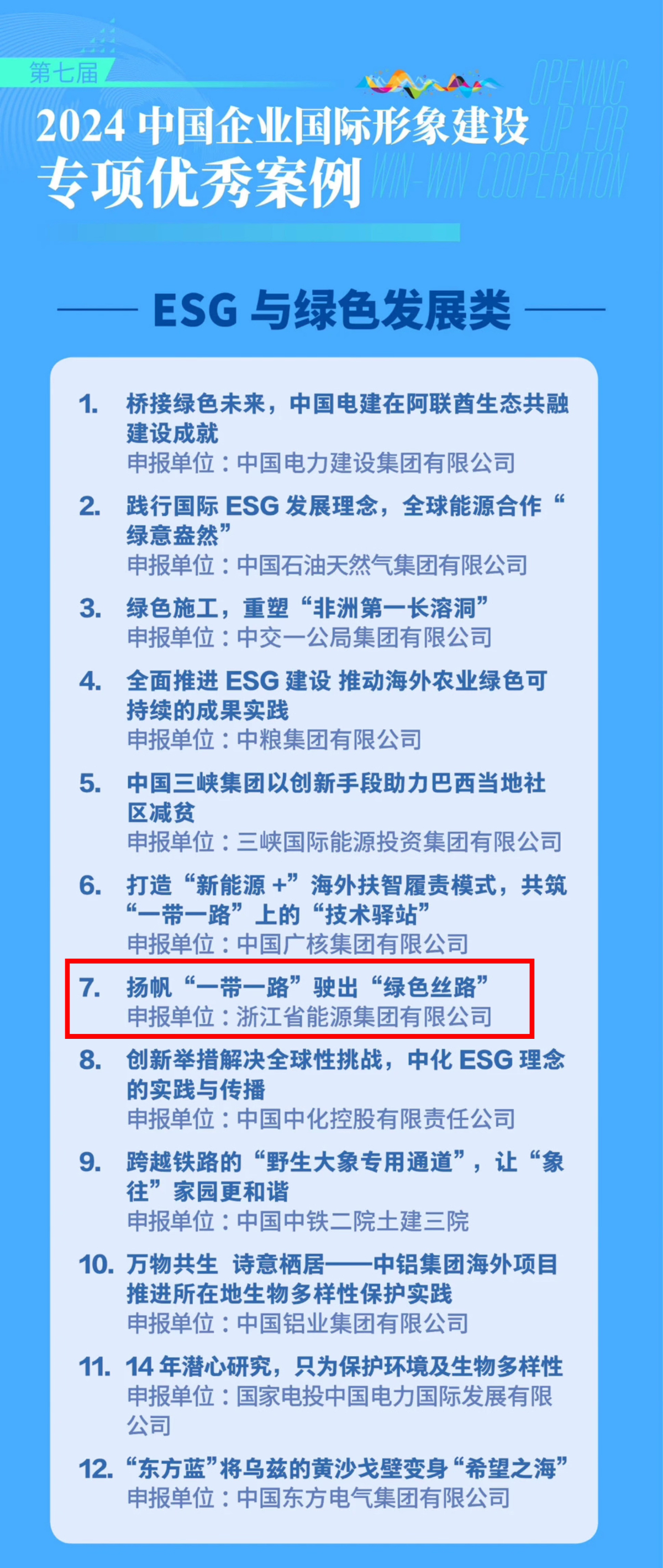 論壇上,“2024(第七屆)中國(guó)企業(yè)國(guó)際形象建設(shè)案例征集活動(dòng)”評(píng)選結(jié)果正式揭曉。來(lái)自浙能集團(tuán)的案例——《揚(yáng)帆“一帶一路”駛出“綠色絲路”》獲評(píng)ESG與綠色發(fā)展類優(yōu)秀案例, 為唯一獲該獎(jiǎng)項(xiàng)的省屬國(guó)企。