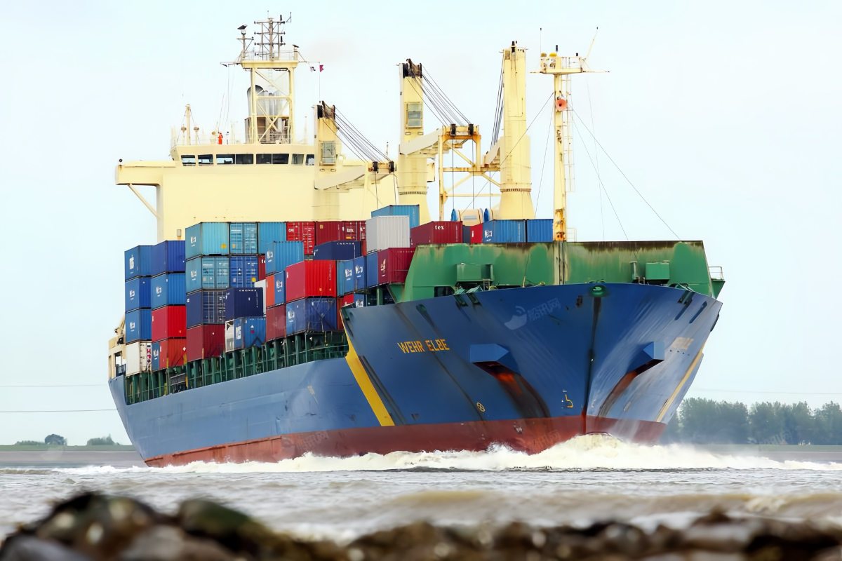 地中海航運(yùn)公司艾爾伯號(hào)遠(yuǎn)洋集裝箱船緩緩駛?cè)胪炼浼R克船廠。 邵子謙 提供
