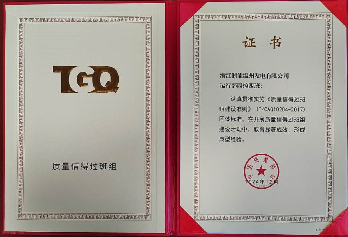 近日,中國(guó)質(zhì)量協(xié)會(huì)公布了2024年度質(zhì)量信得過(guò)班組獲獎(jiǎng)名單,浙能集團(tuán)旗下溫州天達(dá)環(huán)??萍加邢薰竟虖U中心運(yùn)行班組、溫州發(fā)電公司運(yùn)行部四控四班榮獲“全國(guó)質(zhì)量信得過(guò)班組”榮譽(yù)稱(chēng)號(hào)。