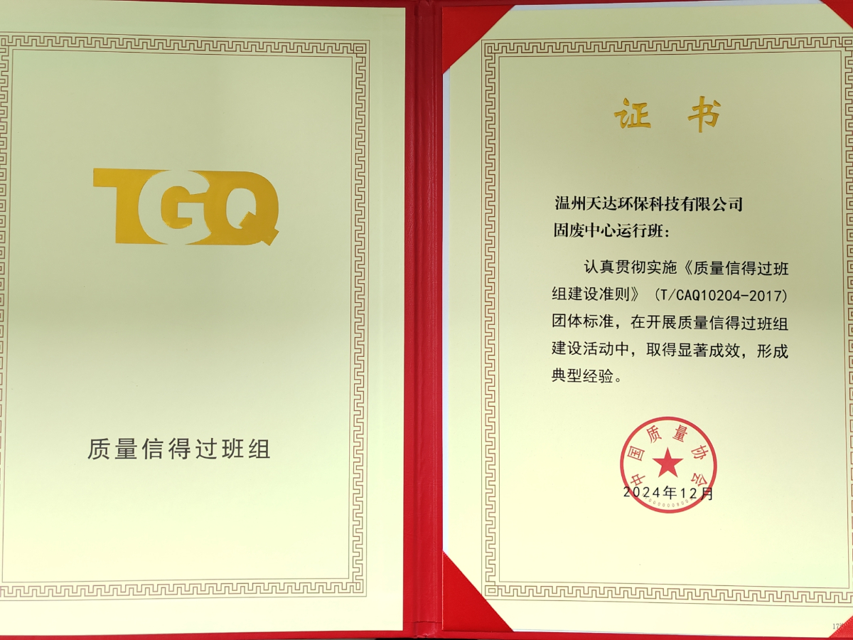 溫州天達(dá)環(huán)保科技有限公司固廢中心運(yùn)行班組“全國(guó)質(zhì)量信得過(guò)班組”榮譽(yù)證書(shū)。 傅催然 攝