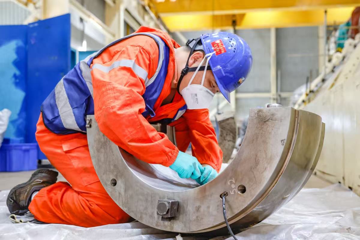 浙能嘉興發(fā)電廠的檢修人員對拆卸下來的軸瓦進(jìn)行細(xì)致的修刮工作。 王侃 攝