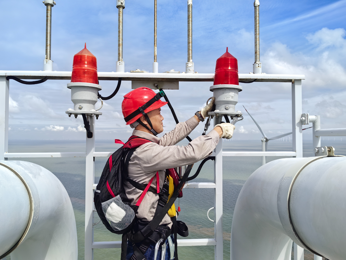 浙能嘉興海上風(fēng)電場維護(hù)人員正在檢修風(fēng)機(jī)航標(biāo)燈。 金山 提供