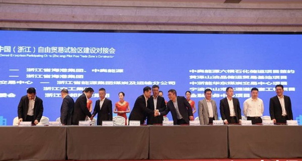 4月21日,煤炭分公司與中國(浙江)大宗商品交易中心在自貿區(qū)對接會上簽署戰(zhàn)略投資協(xié)議。 何玉輝 攝