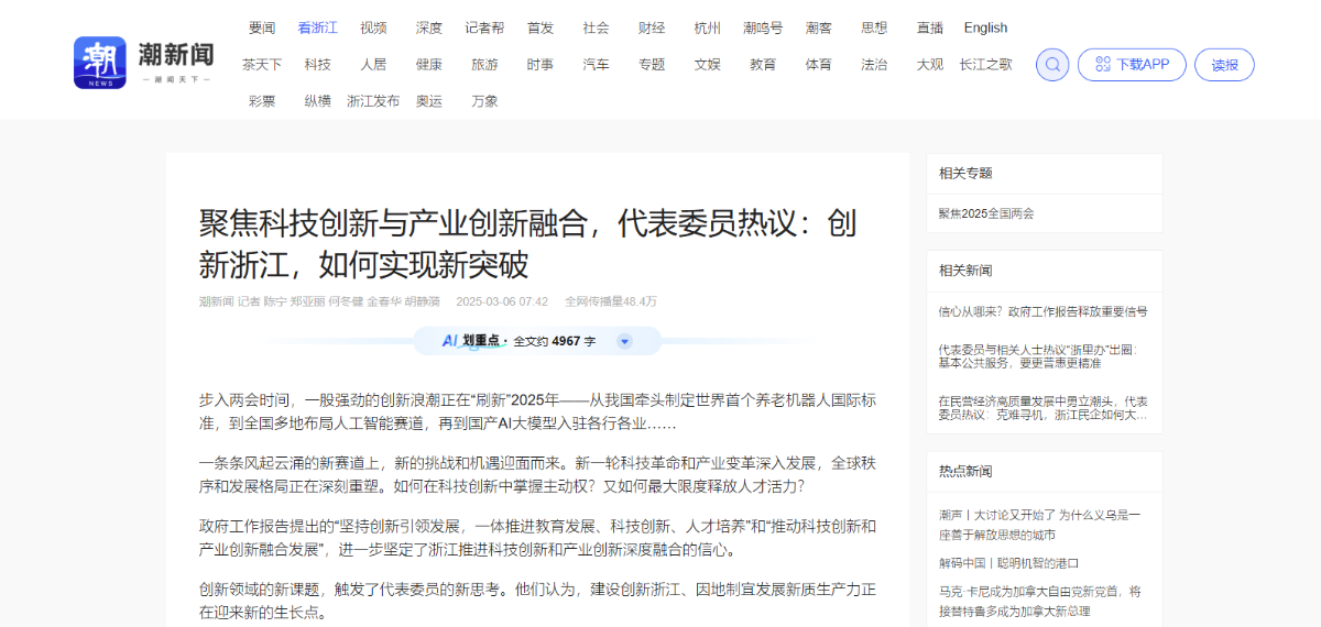 潮新聞報(bào)道《聚焦科技創(chuàng)新與產(chǎn)業(yè)創(chuàng)新融合,代表委員熱議——?jiǎng)?chuàng)新浙江,如何實(shí)現(xiàn)新突破》。 潮新聞客戶端 圖