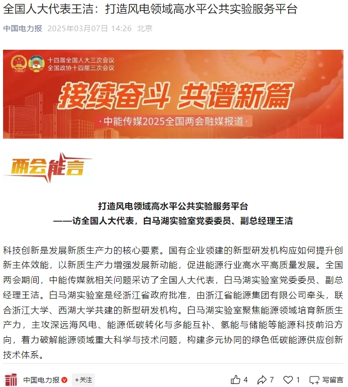 《中國電力報(bào)》微信公眾號(hào)報(bào)道《全國人大代表王潔:打造風(fēng)電領(lǐng)域高水平公共實(shí)驗(yàn)服務(wù)平臺(tái)》。 中國電力報(bào)微信公眾號(hào) 圖