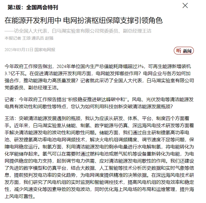 《中國電力報(bào)》報(bào)道《全國人大代表王潔:打造風(fēng)電領(lǐng)域高水平公共實(shí)驗(yàn)服務(wù)平臺(tái)》。 中國電力報(bào) 圖