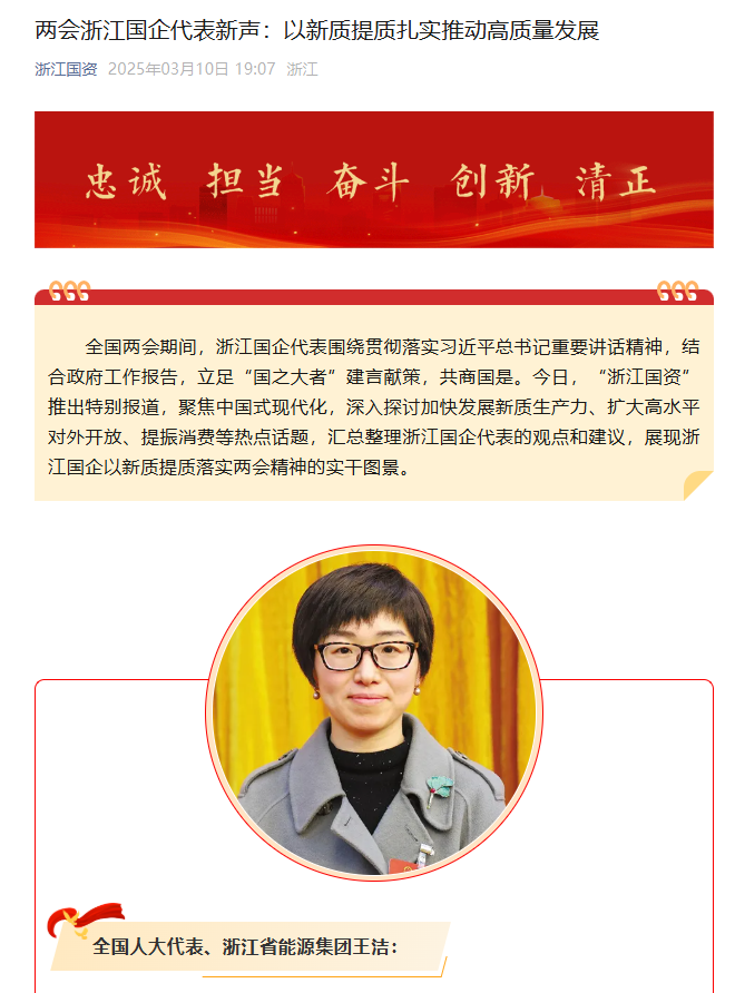 “浙江國資”微信公眾號(hào)報(bào)道《兩會(huì)浙江國企代表新聲:以新質(zhì)提質(zhì)扎實(shí)推動(dòng)高質(zhì)量發(fā)展》。 浙江國資 圖