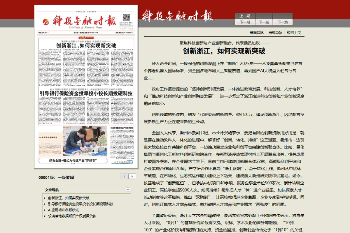 《科技金融時(shí)報(bào)》報(bào)道《聚焦科技創(chuàng)新與產(chǎn)業(yè)創(chuàng)新融合,代表委員熱議——?jiǎng)?chuàng)新浙江,如何實(shí)現(xiàn)新突破》。 科技金融時(shí)報(bào) 圖