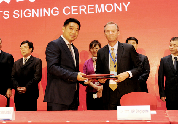 浙能集團(tuán)總經(jīng)理柯吉欣和BP有關(guān)代表,浙能集團(tuán)副總經(jīng)理范小寧和中石化副總經(jīng)理吳燦奇分別在協(xié)議書上簽字。