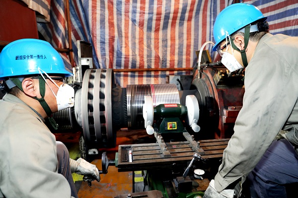 2月15日(大年三十),浙能嘉電公司檢修人員在對發(fā)電機轉(zhuǎn)子集電環(huán)進行施工作業(yè)。 全國琴 攝